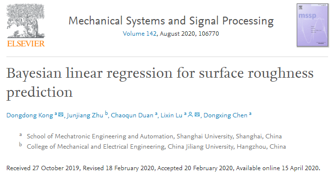 近日,永利集团3044永利集团机械工程在站博士后孔冬冬博士,以第一作者在SCI一区(工程:机械)期刊《Mechanical System and Signal Processing》(MSSP,IF=5.005)上发表了题为“Bayesian linear regression for surface roughness prediction”的论文,永利集团为论文的第一单位,论文的通讯作者为陆利新教授。