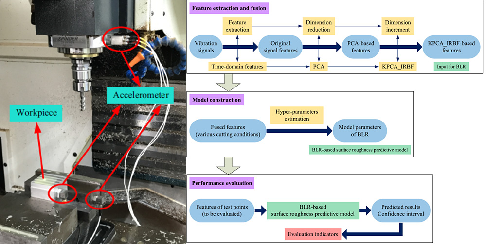 为了提高铣削加工表面粗糙度的预测精度,作者提供了一种独特的特征提取方法,并综合分析了四种贝叶斯线性回归(BLR)模型。其中,标准线性稀疏化预测模型Standard_SBLR系首次提出。监测信号采用工件、夹具和主轴的振动信息,信号特征的提取包含三个阶段:时域特征提取、特征降维和特征升维。作者通过两种铣削实验(顺铣和逆铣),揭示了KPCA_IRBF的特征升维过程对BLR模型预测性能的影响。实验结果表明,在四种BLR模型中,KPCA_IRBF在提高Standard_SBLR的预测精度和压缩置信区间方面是最为有效的。为了进一步证明Standard_SBLR的优越性,还利用偏最小二乘回归(PLS)、人工神经网络(ANN)和支持向量机(SVM)等机器学习方法,在KPCA-IRBF的支持下对表面粗糙度进行了预测。作者的研究成果为工业环境下表面粗糙度的精确监测奠定了基础。