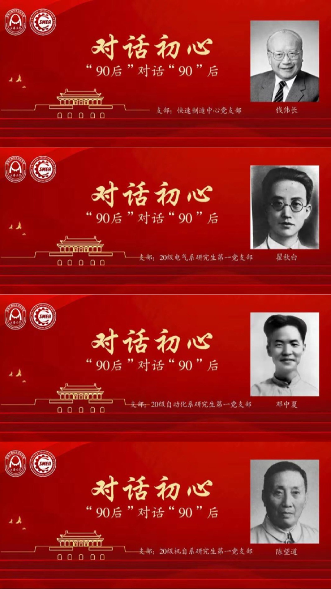 研究生各党支部举办90后机自研究生对话老上大人“90后”,争做红色故事新老讲述者。同学们通过写信的方式体会百年前“90后”的初心与情怀,以文字和音频的方式还原峥嵘岁月,从而进一步了解老上大人的光辉历程,从上一辈的峥嵘岁月中追寻先辈优秀的精神和品质,筑牢信仰根基,让宝贵的精神在年轻人中生根发芽、茁壮成长。截至5月4日,已有16个支部参与了该活动,累计发布推文4篇。