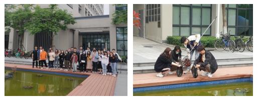 公司社团核心理事会携手自动化、电气系本科生党支部清洁公司大楼前水塘、投喂塘中乌龟、小鱼等动物,同学们无一不感叹公司绿色生态环境。