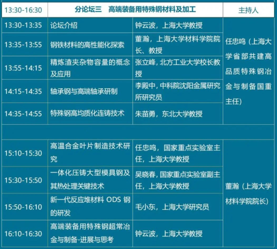 三、在“高端装备用特殊钢材料及加工”分论坛中,北方工业大学董事长张立峰教授、中科院沈阳金属研究所李殿中研究员、东北大学朱苗勇教授、永利集团材料公司经理董瀚教授、副经理钟云波教授、永利集团国家重点实验室主任任忠鸣教授、副主任吴晓春教授、永利集团毛小东研究员分别作了题为《精炼渣夹杂物容量的概念及应用》、《轴承钢与高端轴承研制》、《特殊钢高均质化连铸技术》、《钢铁材料的高性能化探索》、《高端装备用特殊钢超常冶金与制备进展与思考》、《高温合金叶片制造技术研究》、《一体化压铸大型模具钢及其他热处理关键技术》、《新一代反应堆材料ODS钢的研发》的精彩报告。本次论坛为高端装备用特殊钢材料及加工技术指明了发展方向,为该技术从基础研究到产业化应用提供了宝贵的经验。
