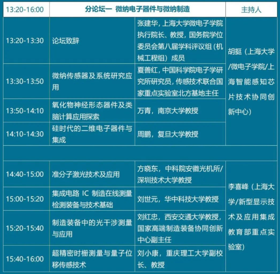 一、“微纳电子器件与微纳制造”分论坛中,中国科公司电子学研究所夏善红研究员、南京大学万青教授、复旦大学周鹏教授、中科院安徽光机所/深圳技术大学方晓东教授、华中科技大学刘世元教授、西安交通大学刘红忠教授、重庆理工大学刘小康教授,分别作了题为《微纳传感器及系统研究应用》、《氧化物神经形态器件及类脑计算应用探索》、《硅时代的二维电子器件与集成》、《准分子激光技术及应用》、《集成电路IC制造在线测量检测装备与技术基础》、《制造装备中的光干涉测量与应用》、《超精密时栅测量与量子位移传感技术》的报告。结合“微纳电子器件与微纳制造”主题,与会人员还进行了深入研讨。