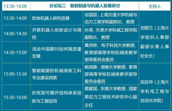 二、在“智能制造与机器人发展研讨”分论坛中,公司组织人事部副部长兼人事处处长、上海市智能制造及机器人重点实验室主任刘丽兰教授致辞后,上海交通大学谷国迎教授、天津大学孙涛教授、电子科技大学黄洪钟教授、湖南大学杨旭静教授、东南大学蔡建国教授,分别作了题为《软体机器人研究进展》、《并联机器人创新设计与调控》、《浅谈中国期刊如何高质量发展》、《智能赋能的机械类新工科专业建设探索》、《折纸型可展开结构体系创新与工程应用》的报告。与会嘉宾就“智能制造与机器人发展研讨”主题,开展了热烈讨论。