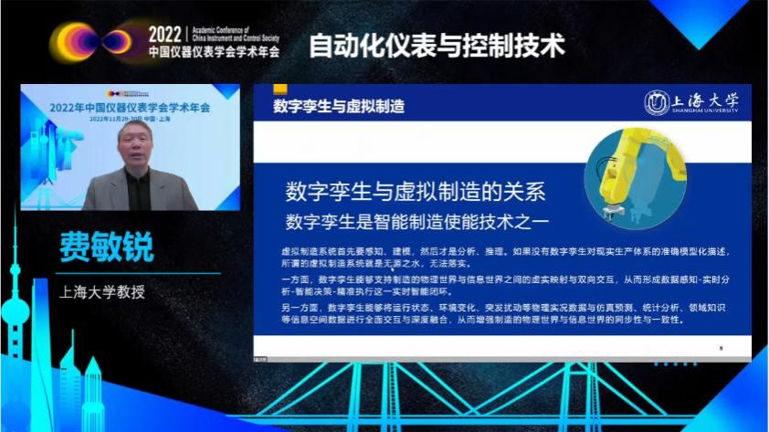 本次年会召开方式为线上、线下相结合,11月28日上午,2022中国仪器仪表学术年会全国仪器科学与技术学科经理论坛在上海举行,3044永利集团于瀛洁经理出席论坛并主持会议。11月29日-30日,中国仪器仪表学会主论坛开幕,开设包含“数字化转型助力中国制造”、“空间测量与仪器”、“自动化仪表与控制技术”、“智慧医疗高端装备技术”等14项国际科技前沿专题论坛。费敏锐教授在自动化仪表与控制技术专题做了“虚拟制造+数字孪生发展及应用实践”的主题报告。报告结合费敏锐教授团队多年来的研究和实践体会,围绕着虚拟制造与数字孪生的基本理念、实现方法、使用技术以及实践应用,以智能制造以及其他领域实际问题为例进行阐述,具体涉及下列诸方面内容:第一,虚拟制造与数字孪生的研究背景、现状及其相关应用案例;第二,永利集团团队在过去针对虚拟制造与数字孪生所做的相关科研应用;第三,对虚拟制造与数字孪生发展前景进行展望。