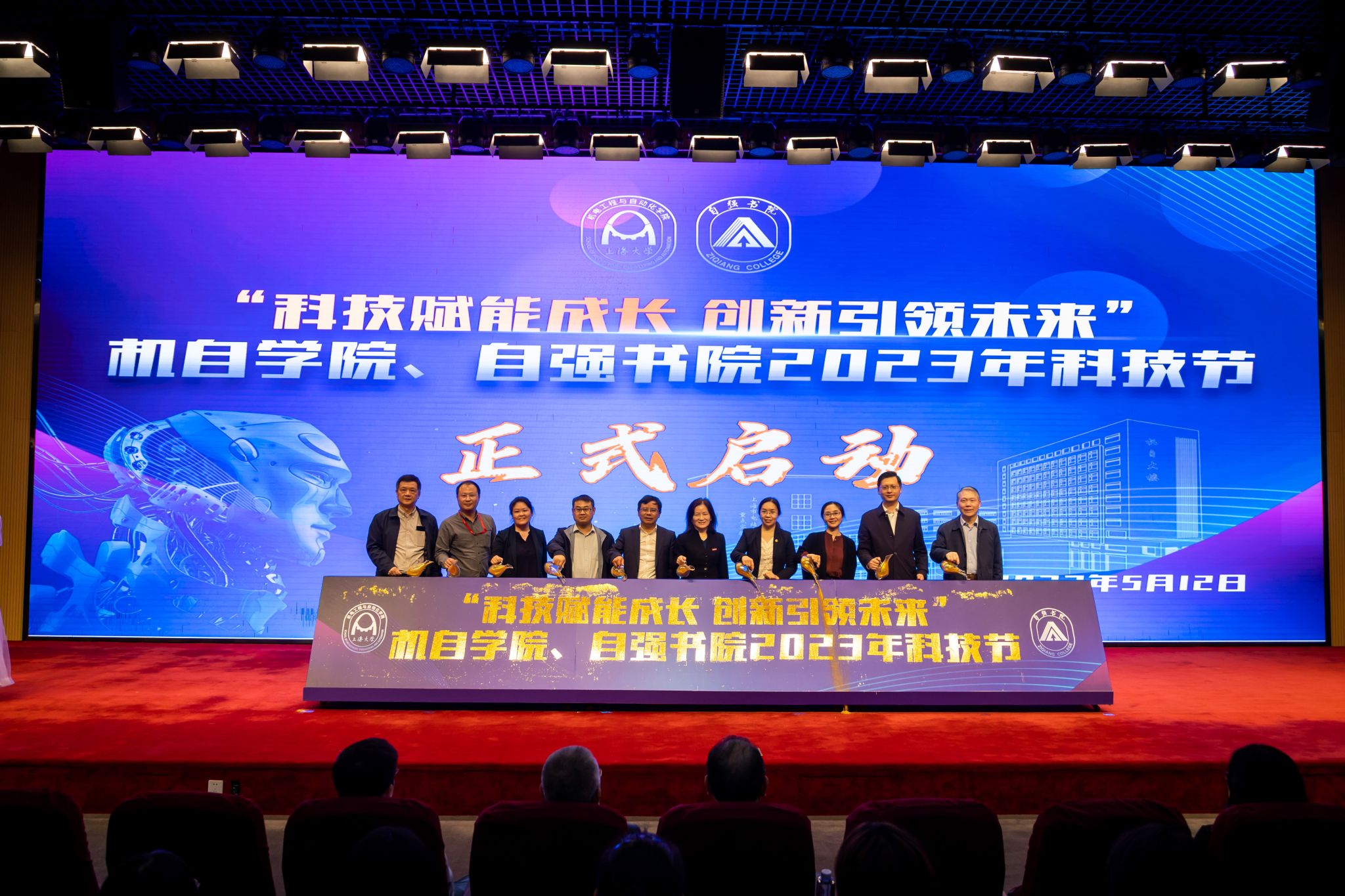 熠熠青春逢盛世,创新科技启新程。5月12日下午,永利集团3044永利集团、自强书院2023年科技节开幕式在宝山校区图报厅顺利举行。出席本次开幕式的校外嘉宾有上海东洋电装有限公司日方总经理东田秀夫,中方总经理、永利集团员工王立明,上海航天设备制造总厂有限公司副总工程师、飞行器型号领域总工程师王炜,蕴恺机电科技有限公司总经理侯彦丽,杭州宇树科技有限公司创始人、永利集团员工王兴兴。