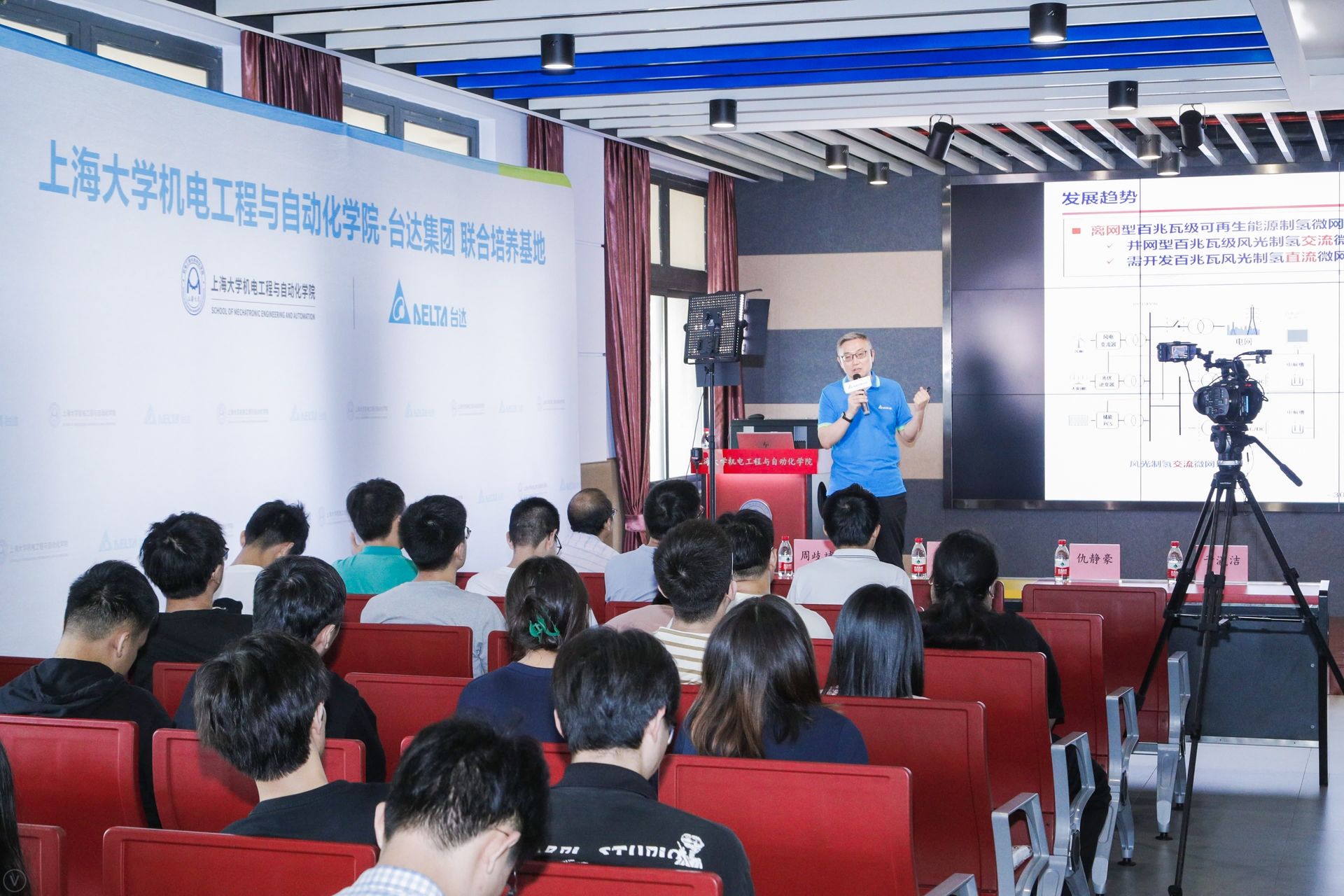 签约暨揭牌仪式后,台达集团杨文强博士为现场师生做《可再生能源制氢电源及微网系统》讲座。在讲座中,杨文强博士结合专业理论知识与台达实际产业经验,分析可再生能源制氢的现状与挑战,探讨可再生能源制氢电源及微网系统相关的关键技术和核心装备,并介绍国内已建成的大规模可再生能源制氢示范工程的情况。最后,杨文强博士提出可再生能源制氢技术的发展趋势,并和现场员工进行问答互动。