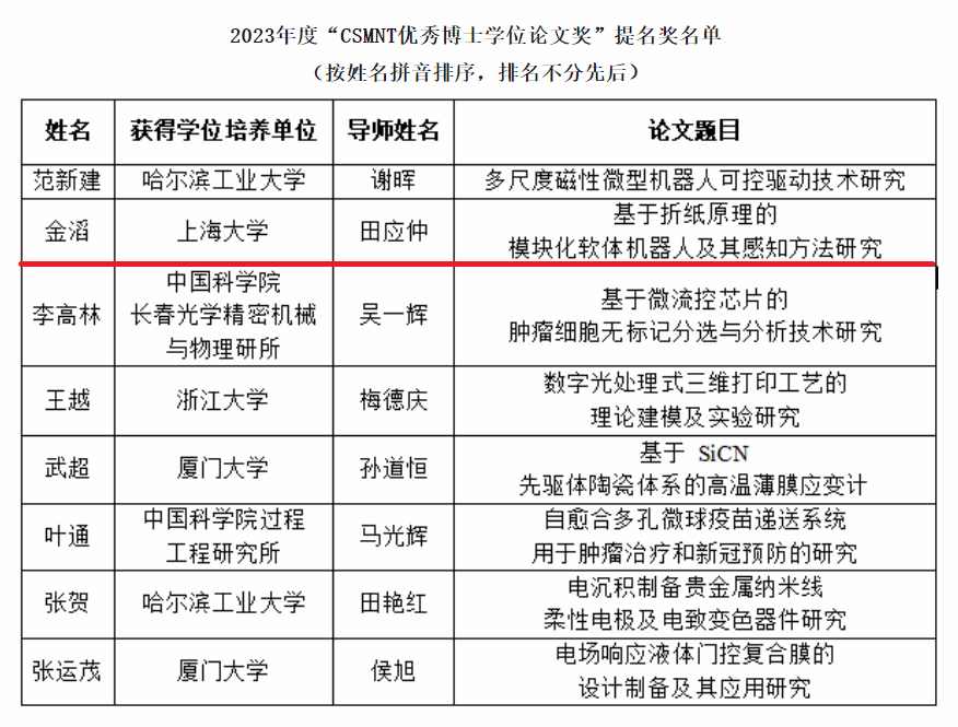 近日,机自系青年教师金滔的博士学位论文《基于折纸原理的模块化软体机器人及其感知方法》获评中国微米纳米技术学会优秀博士学位论文奖提名奖。据悉,本次评选严格遵循《中国微米纳米技术学会优秀博士学位论文评价办法》要求,秉持“科学公正、注重创新、严格筛选、宁缺毋滥”的评选原则。在历经预审查、初评环节后,共有13篇论文入围终评,最终遴选出5篇优秀学位论文,入围的其他8篇论文荣获提名奖。