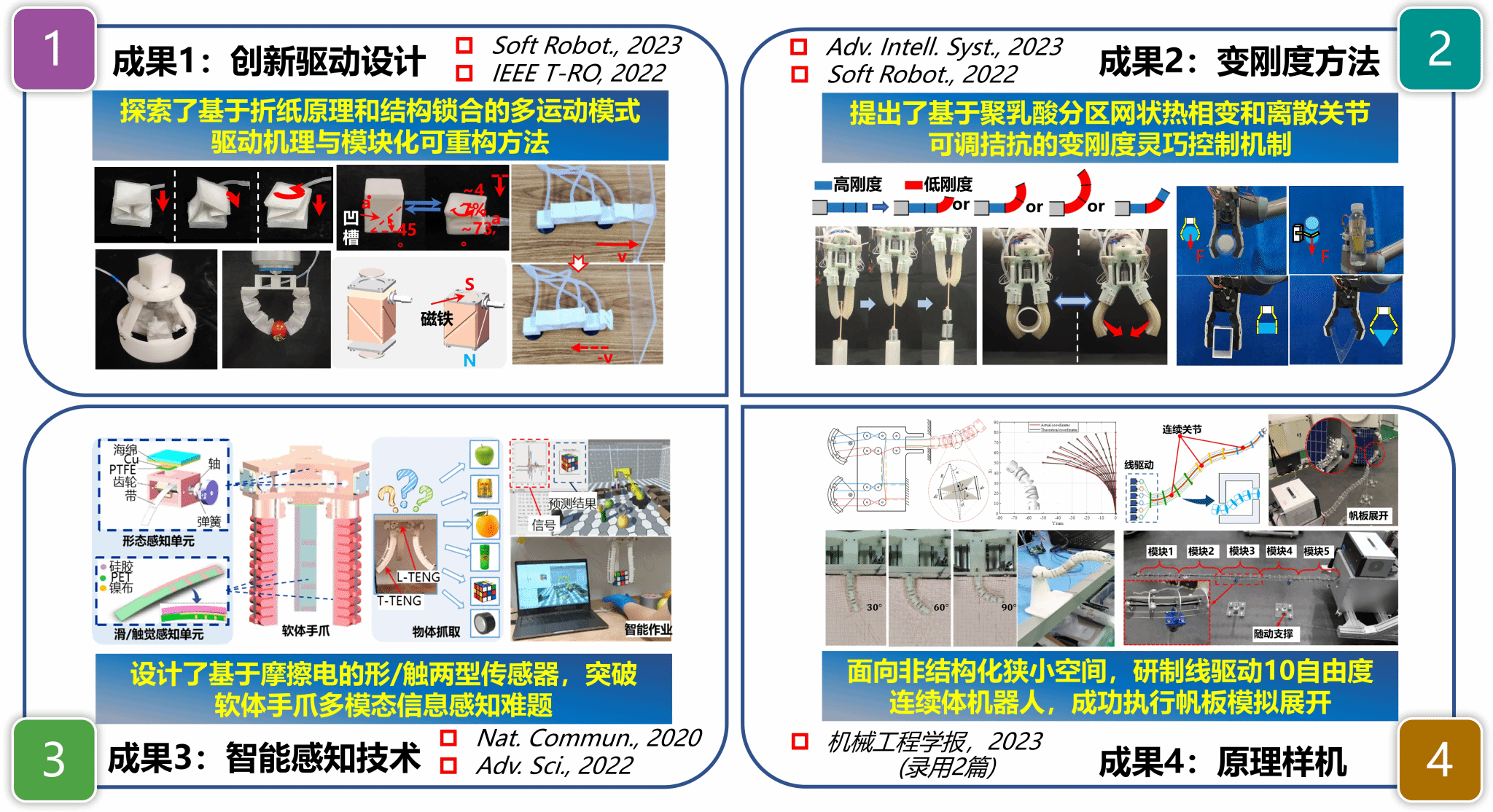 金滔博士为公司自主培养优秀博士,师从机自系田应仲教授,2022年毕业并留校,其主要研究方向为软体机器人及其感知方法。目前,金滔博士主持国家自然科学基金青年基金、国家重点研发计划项目课题等国家/省部级项目4项。近三年,以第一作者或通讯作者发表SCI论文近10篇,包括Nature Communications、IEEE Transactions on Robotics、Advanced Science等国际高水平期刊,2篇论文入选ESI高被引/热点论文,申请/授权发明专利10余项。发表的期刊论文分获2023年世界人工智能大会青年优秀论奖(10篇/年)和2022年IEEE T-RO纪念傅京孙最佳论文荣誉奖(5篇/年),博士学位论文被评为2022 年永利集团优秀博士学位论文(共8篇)。博士期间,曾获永利集团研究生董事长奖学金、方姚自强奖、博士研究生国家奖学金、中科新松特等奖学金等荣誉和奖励。