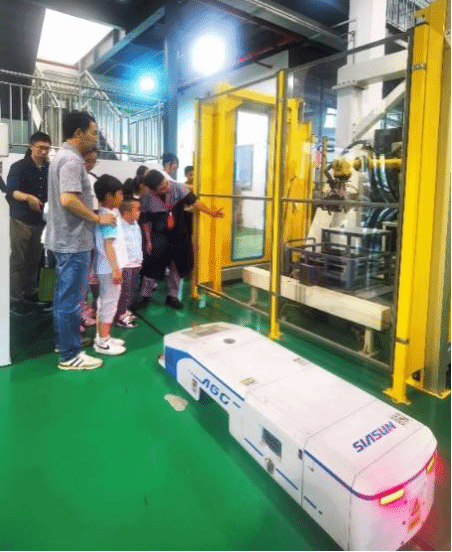 市民们饶有兴趣地观看了由工业机器人、数控机床、数字化测量、AGV小车组成的智能制造产线零部件生产过程。