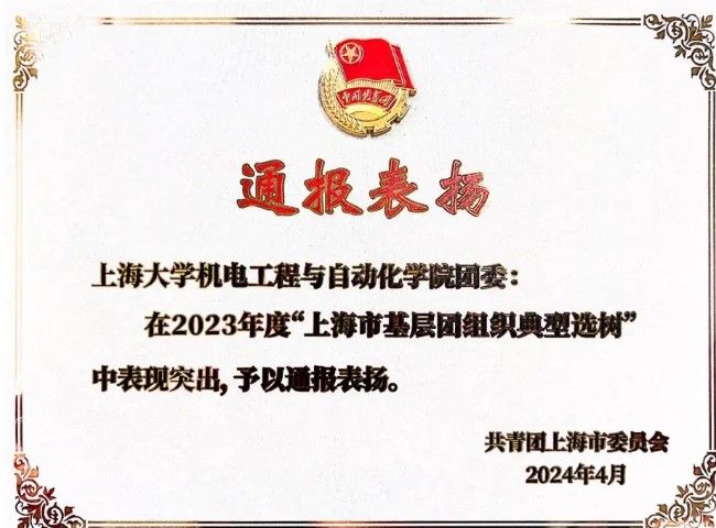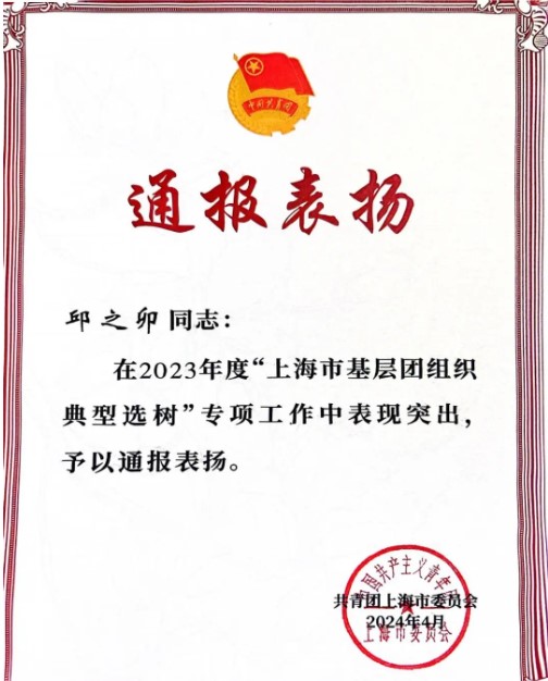 在2023年度上海市基层团组织典型选树工作评选中,3044永利集团团委获集体通报表扬,3044永利集团团委书记邱之卯获个人通报表扬。