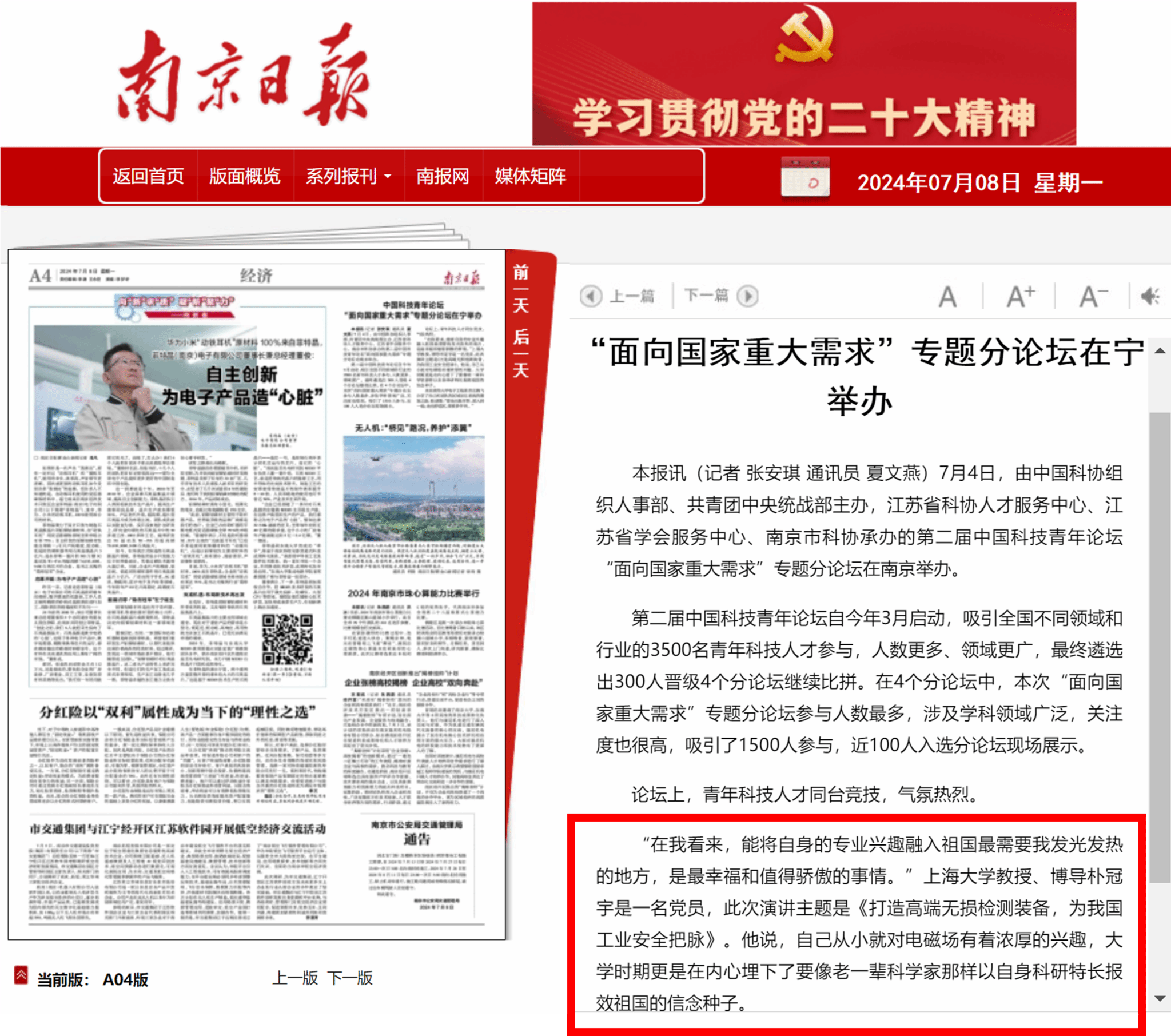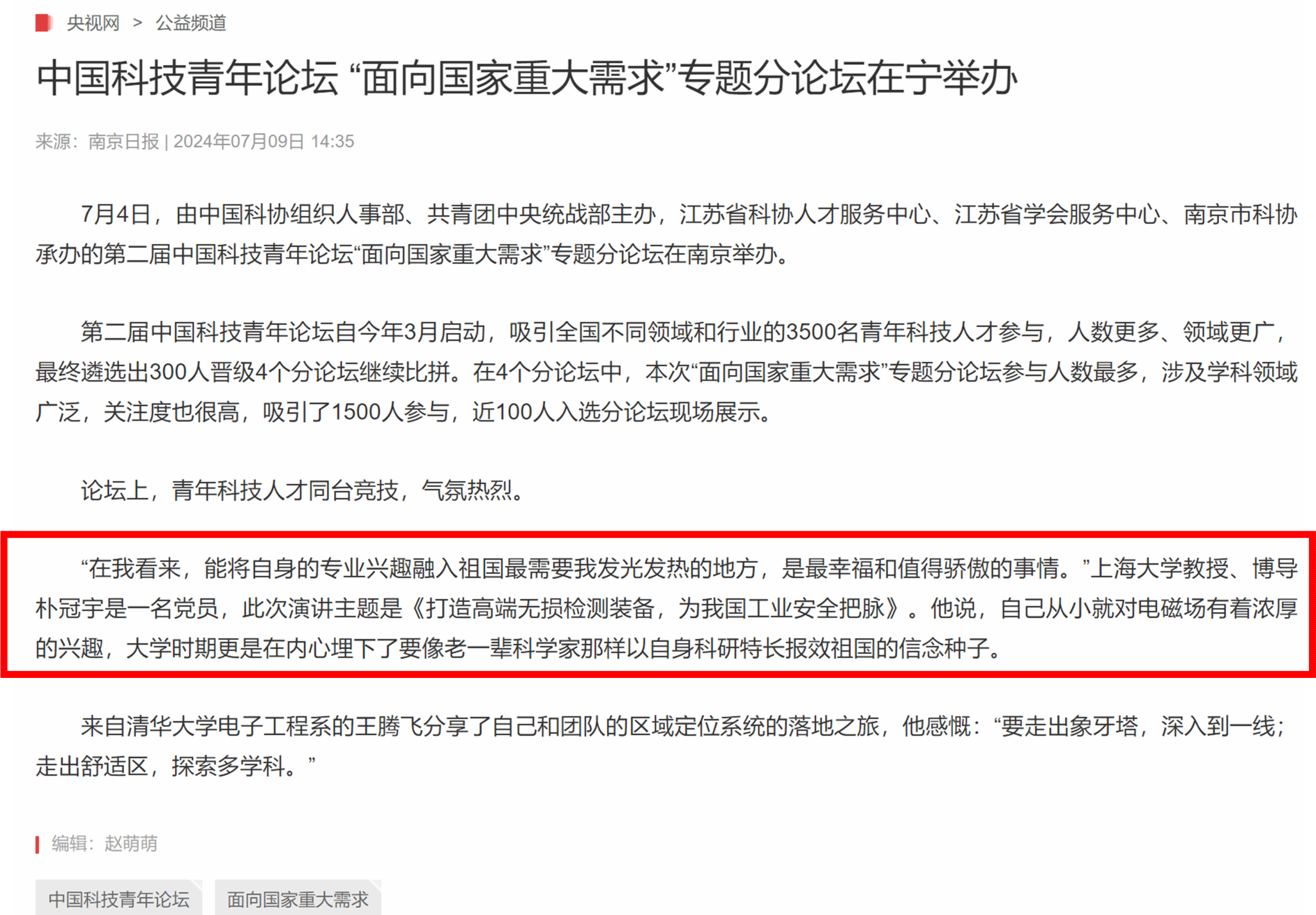 朴冠宇教授的主题演讲展现了青年科研工作者为建设我国科技强国攻坚克难的精气神,得到了在场评委们的一致认可,受到了央视网、南京日报、搜狐网、新浪网等多家媒体的典型宣传报道。朴冠宇教授代表永利集团青年科技工作者参与本次论坛活动,在国家级学术活动中为我国科技高水平自立自强发出当代青年的积极声音,是公司坚持人才引进与人才培养的成果显现。