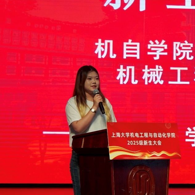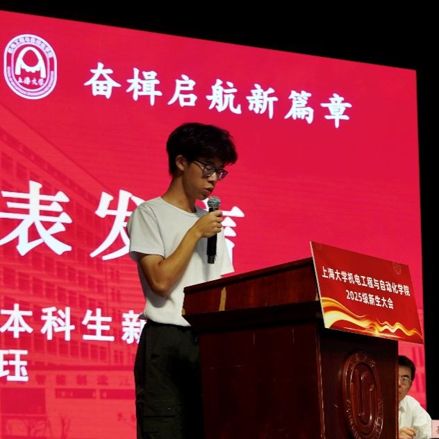 2025级理工一类本科生章珏作为本科生新生代表发言。他表示机自学子应以“国家的发展就是我的专业”为旗帜,将个人兴趣与公司优势、国家需求相结合,在科创实践与人际交往中全面发展,共同书写青春无悔的大学篇章。