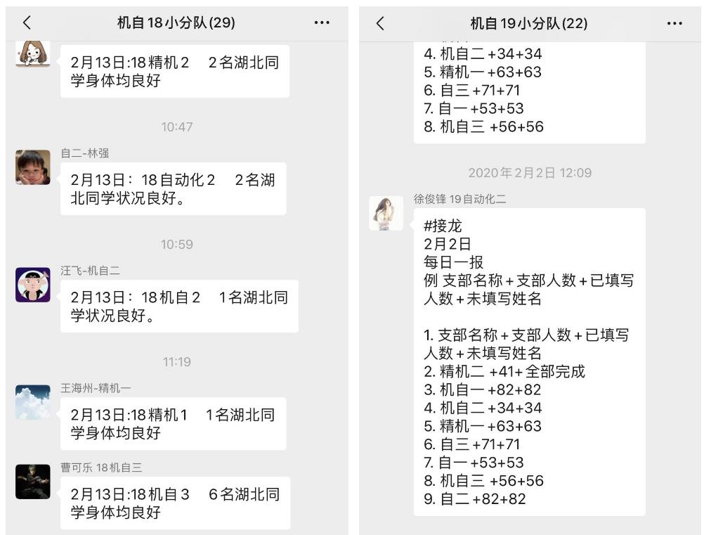 “在这个没有硝烟的战场,每一个人都是主角!向所有一线医护人员及为疫情奔波的人们致敬!”这是身处武汉的公司党委自动化系2017级研究生第三党支部书记江浪同学的心声,也是更多机自研究生们的身体力行。作为一名党支书,他在响应号召“不出门”的同时,主动承担了班级19名党员和48名团员同学的情况排摸、统计报告工作,及时、准确地上传下达各类信息和通知。家里的网络不稳定,他就用着自己的手机流量开热点。对于没有及时回复的同学,他通过电话、短信、室友、同门等各种方式了解情况、联系同学,确保信息全覆盖。他还反复呼吁大家减少出门、戴上口罩、洗手消毒、开窗通风、自觉隔离。身处疫情重点区域,他更能设身处地地理解大家的关切和焦虑,带头做防控知识的传播者、疫情谣言的制止者、健康心理的支持者。