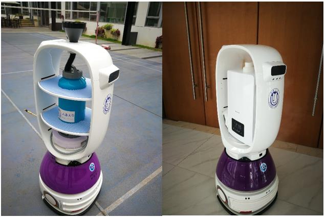 上大团队先后设计了6种机器人构型,并最终确定了两款可适应于室外、室内作业的喷雾、干雾智能消毒机器人构型;为了让机器人作业现场能快速部署并投入应用,刘丽兰教授将团队自主研发的机器人操作系统进行了裁剪与定制,首次实现了导入建筑平面图机器人地图快速构建模式,以及手绘路劲识别、高速无线局域网通信等功能,为消毒机器人的智能进一步赋能。基于上海擎朗智能科技的移动平台,研究团队攻克了液体闪蒸-干雾与空气残留处理、消毒过程精准量化管理、智能控制与系统集成等关键技术,根据机器人作业环境空气数据与空间体积实时计算与智能控制,成功研制了满足实际作业功能的智能消毒机器人,包括:出雾速度、密度、角度、高度可调可控;单次、连续、循环多种工作模式;关键点、临时点、常规线路全覆盖;智能作息、错峰作业等新功能。