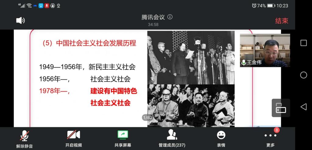 王金伟老师从什么是“四史”及学习“四史”的重要性作为开篇,讲解了从空想社会主义到科学社会主义,从早期“有中国特色社会主义”到21世纪开始的“中国特色社会主义”,深入浅出的讲述了中国特色社会主义的渊源和发展;进而分析了中国改革开放及其重大的历史意义,中国从“建设小康社会”到“建成小康社会”变化中,体现了改革开放的伟大成果。王老师强调历史是最好的教科书,也是最好的清醒剂,我们要正视历史,学习历史,以史为鉴。