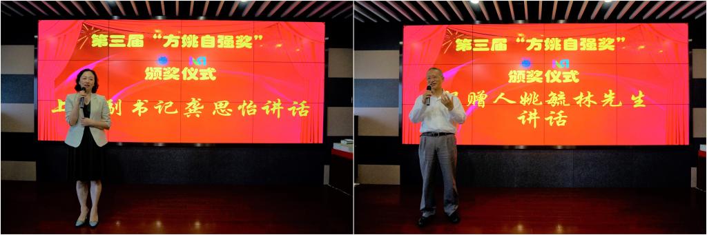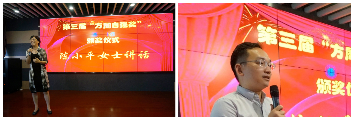 接着,龚思怡、姚毓林、陈小平、陈然、陈方泉、于瀛洁发言。设奖人姚毓林员工、陈小平女士代表设奖人周忻员工对获奖师生表示祝贺,并希望师生们能够再接再厉,争取取得更多更佳的佳绩。龚思怡、陈然、陈方泉、于瀛洁代表公司、公司感谢优秀员工姚先生、周忻先生对公司的支持,感谢方明伦教授多年如一日潜心科研、关爱师生并促成“方姚自强奖”“方周自强奖”的设立。同时,对获奖教师表达了祝贺,并鼓励师生们能够激流勇进、获得更多成就和进步。