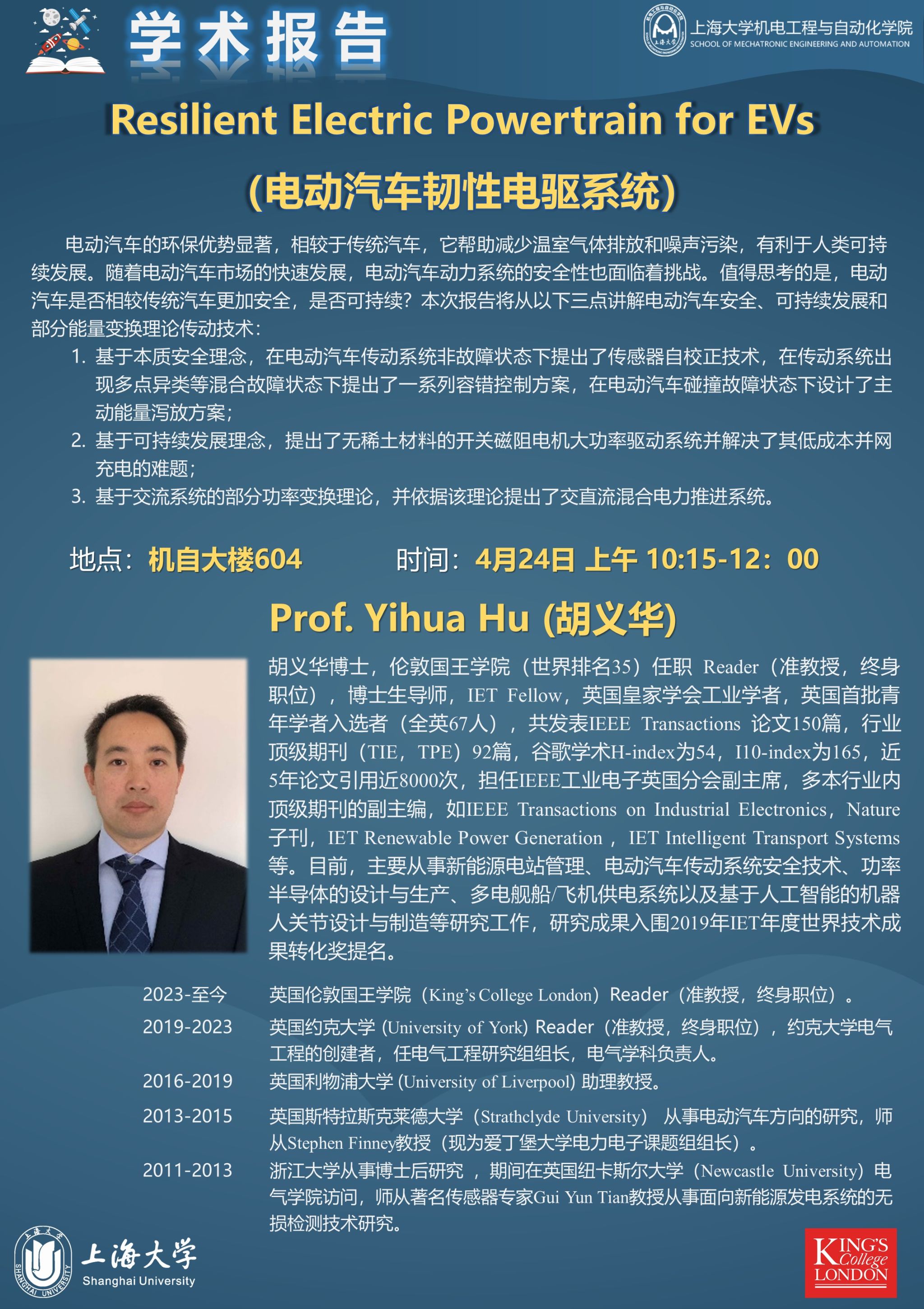 报告人简介:胡义华博士,伦敦国王公司(世界排名35)任职 Reader(准教授,终身职位),博士生导师,IET Fellow,英国皇家学会工业学者,英国首批青年学者入选者(全英67人),共发表IEEE Transactions 论文150篇,行业顶级期刊(TIE,TPE)92篇,谷歌学术H-index为54,I10-index为165,近5年论文引用近8000次,担任IEEE工业电子英国分会副主席,多本行业内顶级期刊的副主编,如IEEE Transactions on Industrial Electronics,Nature子刊,IET Renewable Power Generation ,IET Intelligent Transport Systems等。目前,主要从事新能源电站管理、电动汽车传动系统安全技术、功率半导体的设计与生产、多电舰船/飞机供电系统以及基于人工智能的机器人关节设计与制造等研究工作,研究成果入围2019年IET年度世界技术成果转化奖提名。