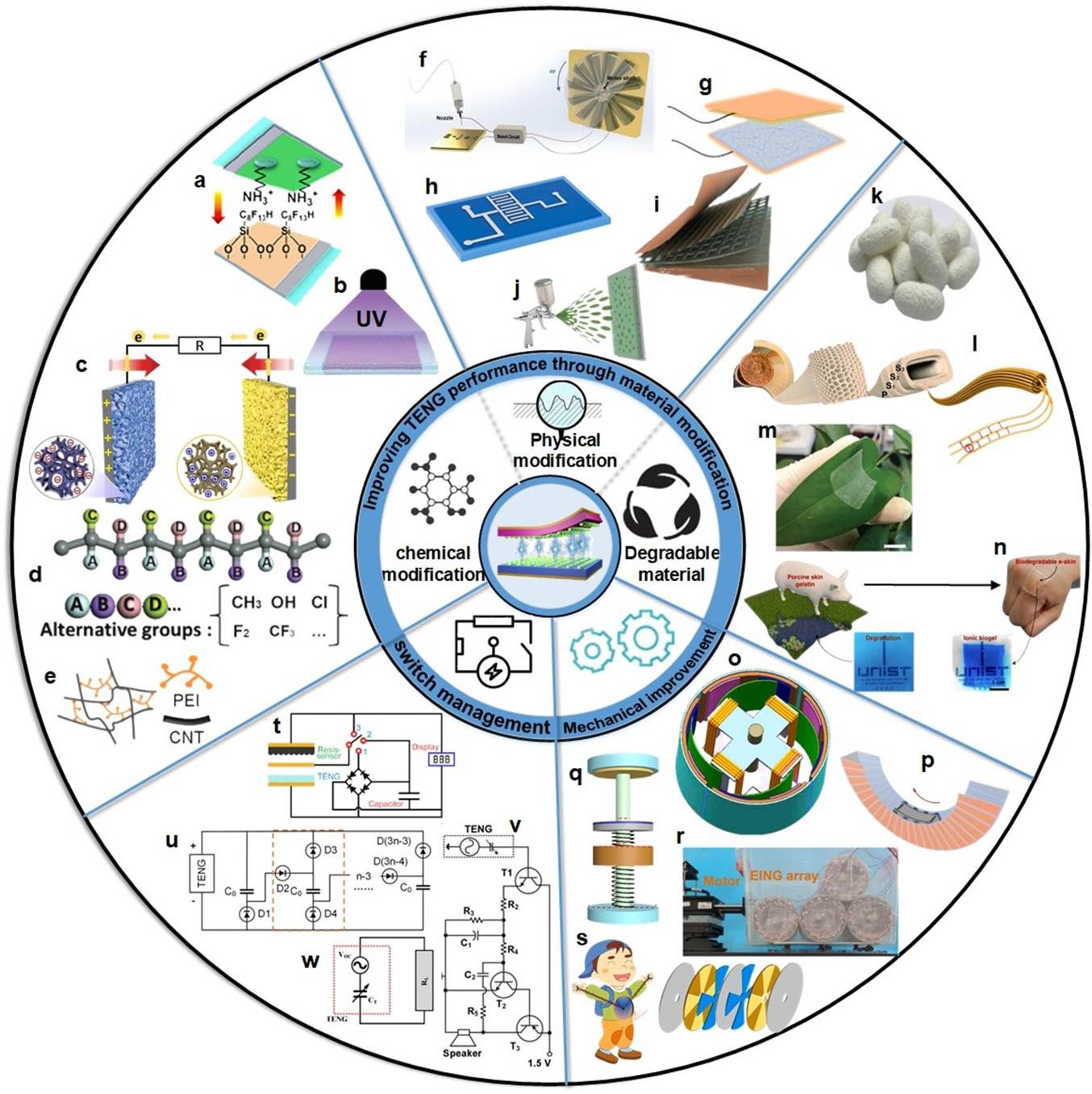 本综述系统地总结了基于不同策略提高TENG输出性能的研究进展。首先,对TENG的表面材料选择和处理方法进行了分类。根据处理方法的不同,表面材料的改性方法分为物理改性和化学改性。其次,考虑了通过制备高性能生物降解材料来提高TENGs的输出性能,包括纤维素基材料、人造高分子材料和生物基材料。然后,总结了基于不同机械设计提高输出性能的研究进展。此外,从电路开关(包括机械和电子开关)的角度介绍电路管理的代表性研究。最后,简要概述了TENG在提升输出性能的研究中所面临的挑战和发展前景。