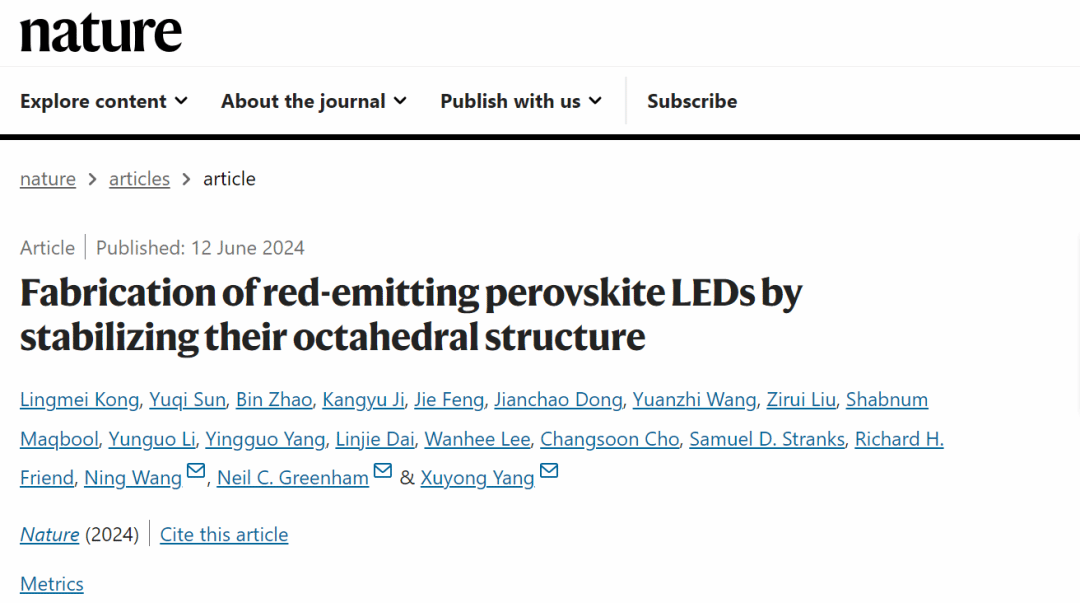 2024年6月12日,3044永利集团新显教育部重点实验室杨绪勇教授研究团队与合作单位团队关于“稳定钙钛矿八面体实现高效红光LED”最新研究成果,以Fabrication of red-emitting perovskite LEDs by stabilizing their octahedral structure为题在国际顶尖期刊Nature上发表,论文链接:https://www.nature.com/articles/s41586-024-07531-9。
