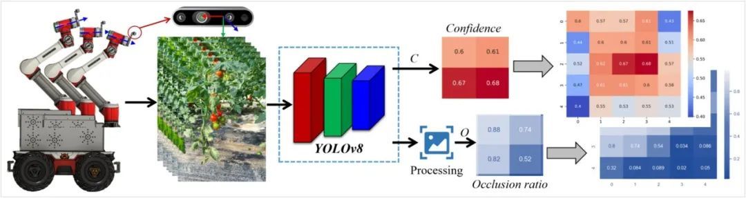首先,通过分割网络提取目标的感兴趣区域,然后利用图像处理方法获取目标的遮挡状态。以当前观测位置为起点,在矩阵内移动摄像头,形成置信度和遮挡率分布图。在建立了一系列遮挡率和置信度矩阵数据集后,训练了一个设计好的深度网络,用于在估计当前遮挡状态后预测置信度最高/遮挡率最低的位置。为了验证该方法的可靠性,针对苹果和成簇的番茄进行了实验室和田间实验。