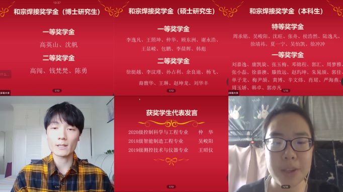 典礼开始,杨扬老师代表公司向全体获奖员工表示最衷心的祝贺,对大家过去一年中所付出的努力表示肯定,鼓励同学们再接再励,保持进步争取更大的成就,同时也向关心支持公司人才培养的上海和宗焊接设备制造有限公司表示感谢。随后,肖莉主管依次宣读了获奖员工名单,本次奖助学金评选经过个人申请、班级初评、公司复审等流程,共有69名本科生和23名硕博研究生获得和宗焊接奖学金、26名本科生获得和宗焊接助学金。来自2018级智能制造工程专业的吴峻阳同学、2019级测控技术与仪器专业的王昭仪同学和2020级控制科学与工程专业的仲华同学分别发言,三位同学对助力个人成长成才的爱心人士、公司和老师们表达了真诚的感谢,感谢企业在社会责任方面树立的良好榜样,今后会常怀这份爱全身心投入到未来的学习和工作中,同时将这份友爱互助传递给身边更多有需要的人。