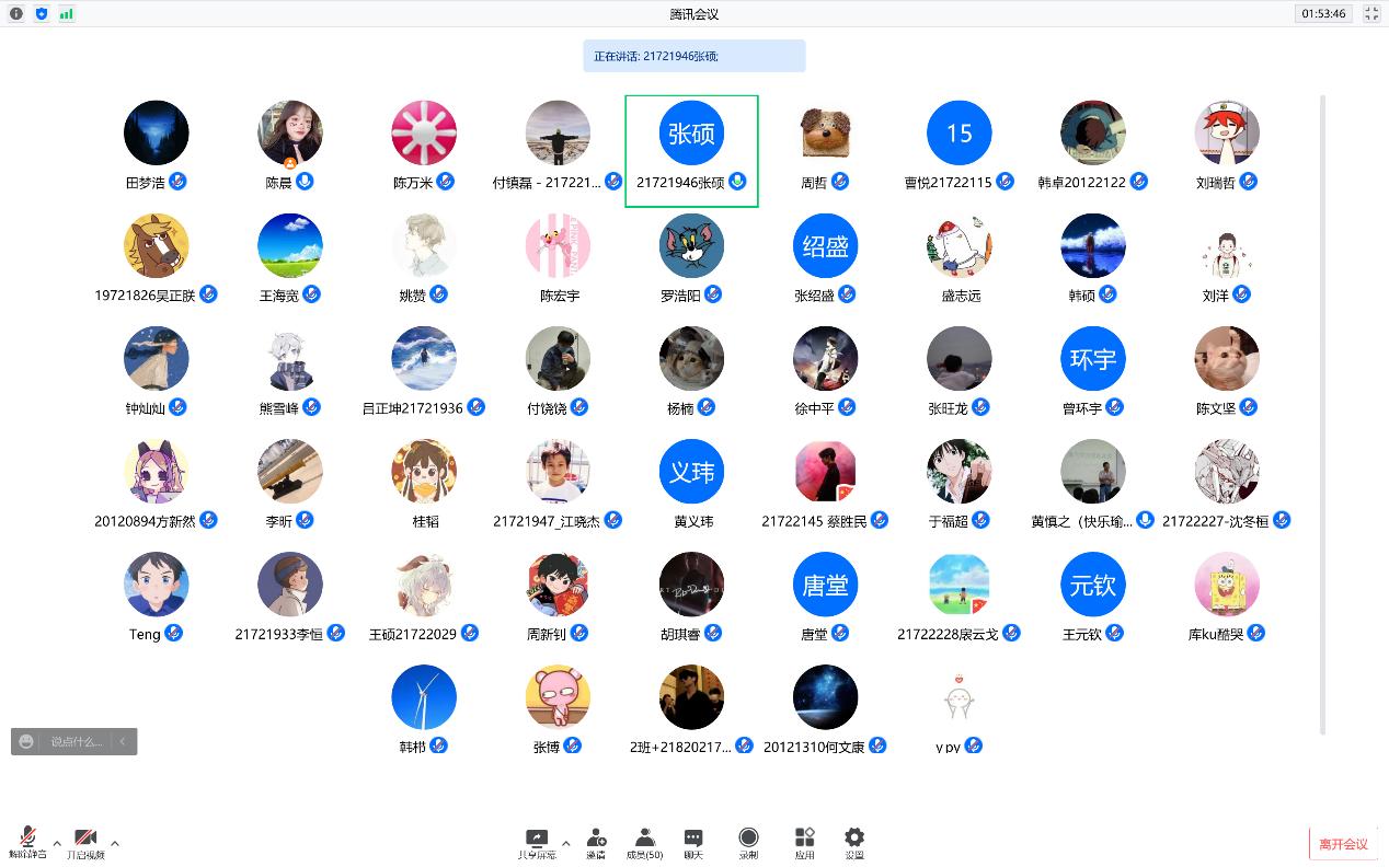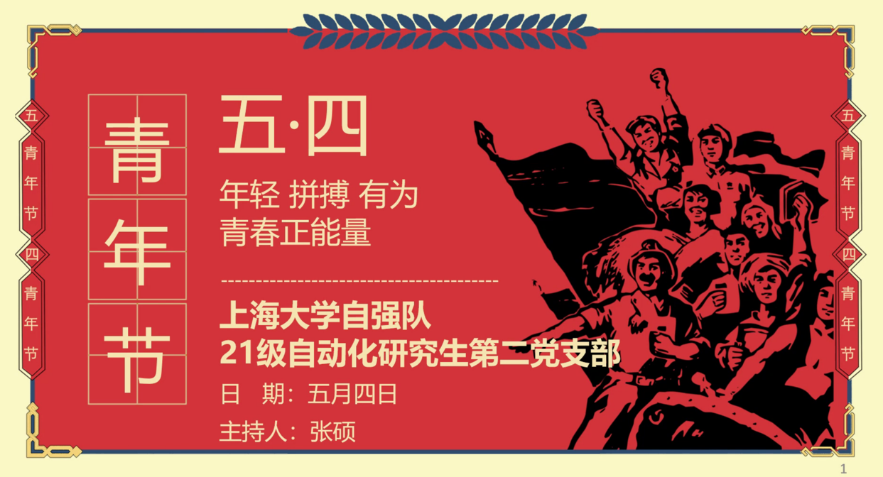 恰逢五四青年节到来之际,为缅怀革命先烈,发扬五四精神,增强广老员工的使命感和责任感,在自强队指导老师王海宽、李昕、韩栉和黄慎之老师的带领下,自强队在读的研究生、本科生队员、21级自动化研究生第二党支部等员工和前自强队指导老师陈万米共五十人共聚云端,迎来了一场特殊的相遇。自强队一直保持着在五四青年节开展一些有意义活动的传统。由于今年疫情影响,公司进行封闭管理,自强队大家庭虽没能在线下聚首共庆五四,但在云端相聚也丝豪不影响自强队青年们对弘扬五四精神的那份热情,学五四精神,传递自强队精神——自强不息;先天下之忧而忧,后天下之乐而乐。