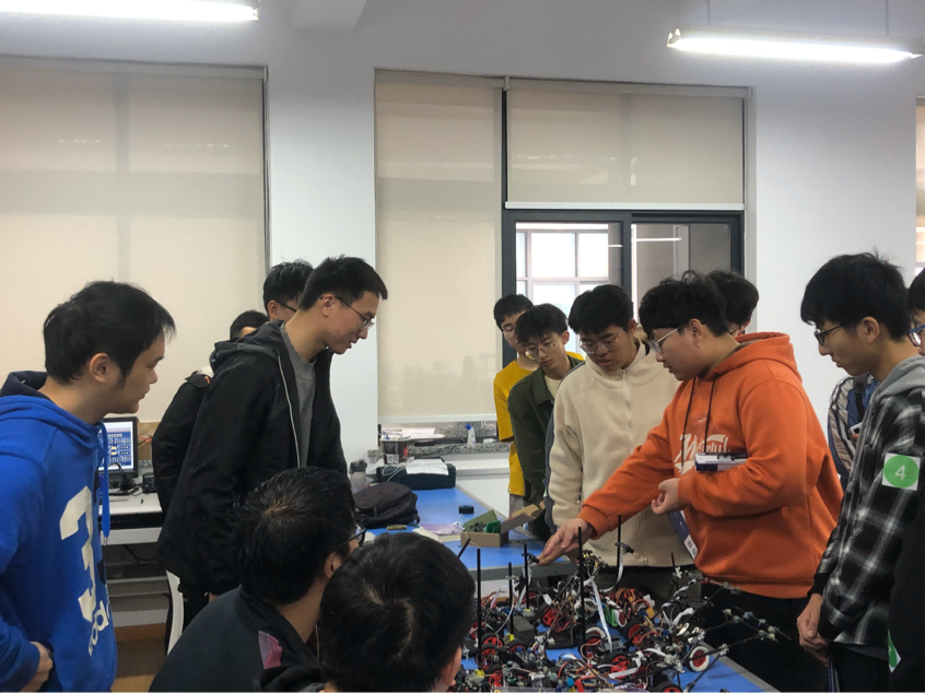 25日早上8:30前自强队黄老师和队员们早已在等候。参观者首先来到自强队347综合实验室,自强队负责人曾环宇带领研究生们鼓掌欢迎参观者的到来,首先由黄老师慷慨激昂地介绍了自强队,他向大一员工们展示了自强队荣获的上海市青年五四奖章(集体)和玻璃柜里摆放的各类奖章奖杯,并强调员工要践行钱伟长董事长所说的“员工的培养更重要在课外”,鼓励员工在课余要积极参加科创活动,以提升自己的创新和动手能力。接下来是介绍家庭服务机器人和投篮机器人。家庭服务机器人组研一的刘洋向员工展示实体家庭服务机器人的同时,结合比赛视频,向员工介绍机器人的人脸识别、声源定位以及语音识别等功能;投篮机器人组研二的林城对放在桌上拆卸分解的投篮机器人进行讲解,对底盘驱动、控制模块、投篮机构等各部分进行了详细的介绍,并告诉大一员工这些都是自强队的员工自己做的,在近几年中国机器人比赛中始终保持在冠亚军。在与员工互动中解答了他们提出的问题,大一的同学表现出极大的兴趣,也为自强队所取得成绩报以掌声。