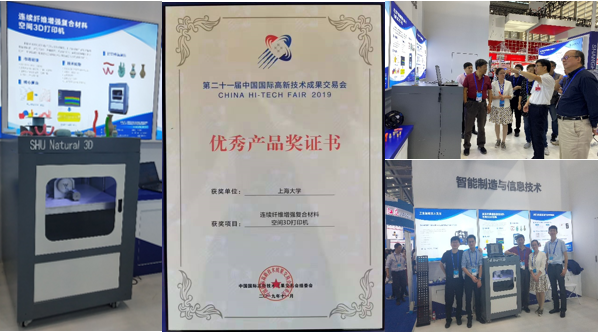由公司快速制造工程中心自主研制的“连续纤维增强复合材料空间3D打印机”参加了本次展会,并获得了优秀产品奖。本展品针对3D打印存在的支撑不可避免、打印件强度不高和表面质量差等问题,结合FDM、多轴数控、无支撑打印、连续路径规划等多项技术,实现了各类连续纤维增强复合材料的无支撑及空间打印。该装备在展会上获得较多的关注,也与个别企业达成了初步合作意向,为其实现科研成果转化提供了良好契机。