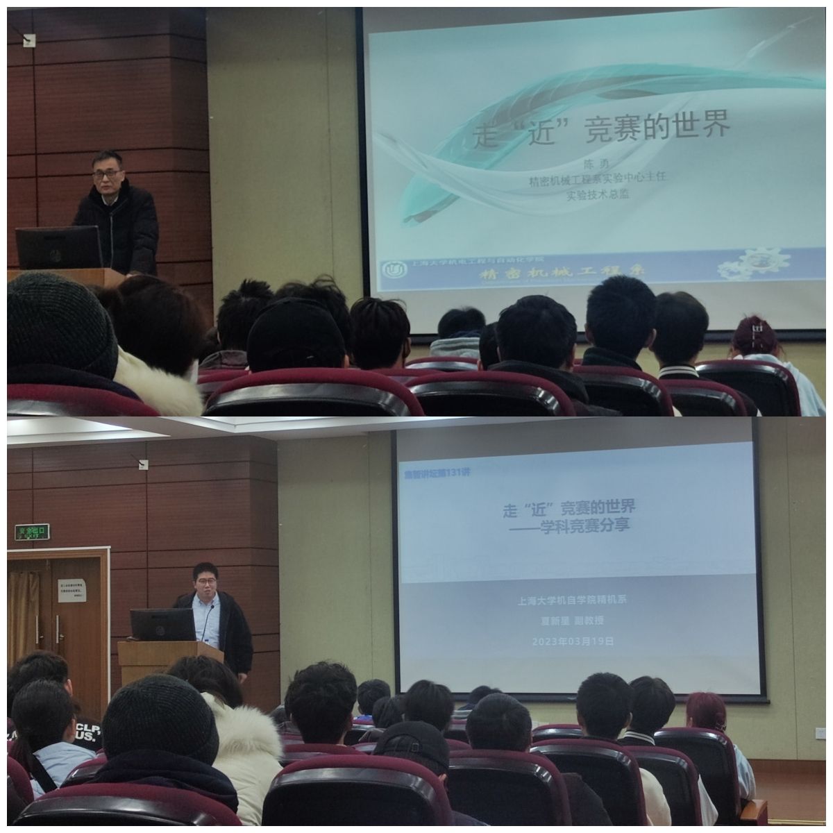 下午15:00,在蔡冠深讲堂,为帮助同学们了解和专业相关的竞赛信息,特邀请了精密机械工程系实验中心主任、实验技术总监、高级实验师陈勇老师和测控技术与仪器教研室副主任、夏新星副教授为同学们开设了两场集智讲坛——走“近”竞赛的世界。两位老师分别从自身擅长的领域为同学们介绍了各类竞赛项目,从报名注意事项、赛事历届比赛作品等方面带领大家走近竞赛的世界。讲座中还邀请到了第十届全国老员工光电设计竞赛三等奖、第十届全国老员工光电设计竞赛东部区赛一等奖获奖者、测控技术与仪器专业的赵艺菲同学,2022年中国老员工机械工程创新创意大赛机械产品数字化设计赛一等奖的获奖团队,来自机械电子工程专业的李畅、朱致辰、项重远三位同学为大家带来分享。“竞赛不是大佬才可以参加……”同学们朴素的分享中,透露出他们在竞赛中得到的锻炼与成长,台下的同学们听了都非常激动,希望自己能够尽早参与到各类竞赛中。在首日教育结尾,李云龙老师就今天的首日教育内容进行了总结,并重点强调了诚信考试、考场规则、日常上课出勤等问题。