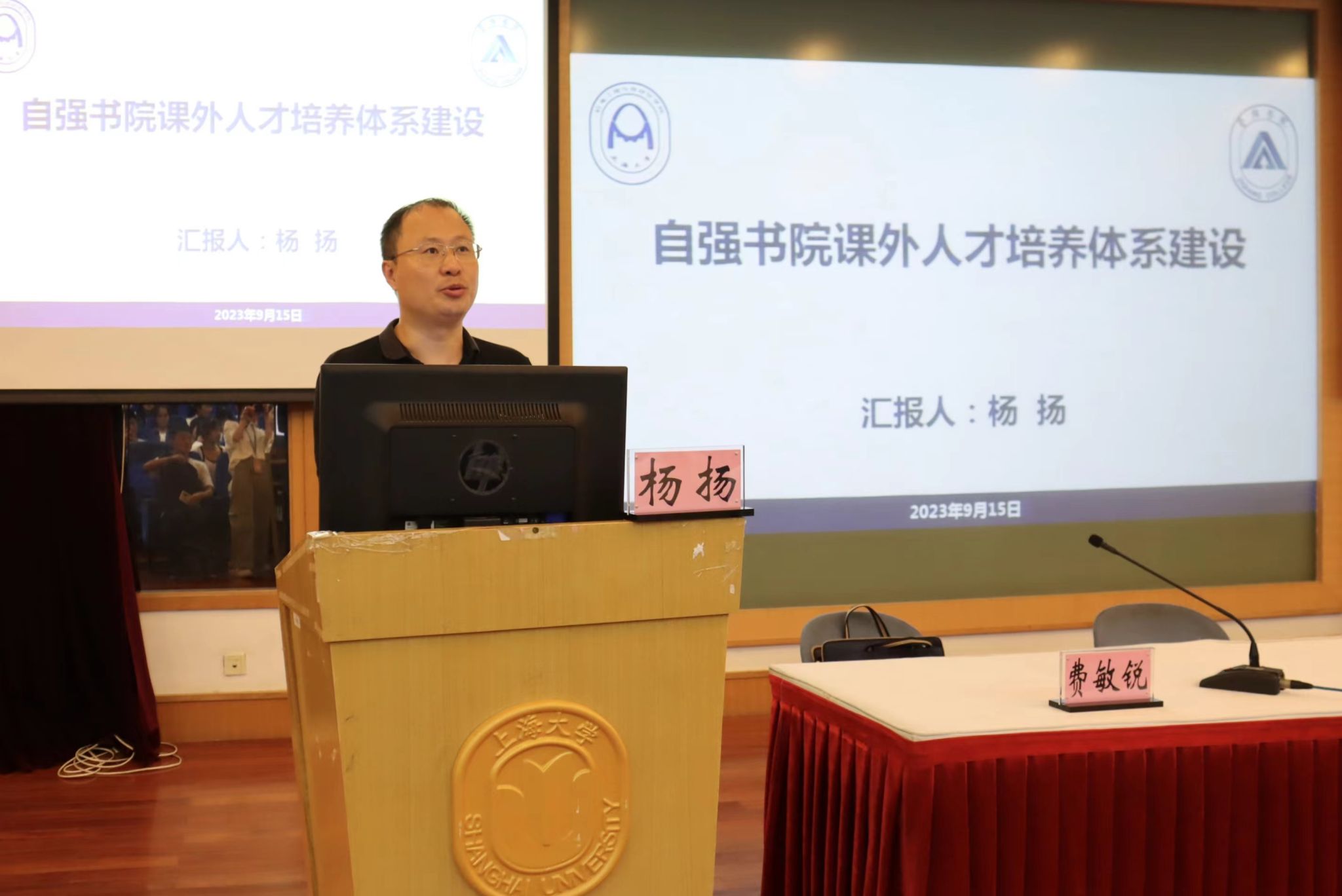 会议伊始,自强书院执行经理杨扬向大家介绍自强书院人才培养的建设情况。杨扬老师总体介绍了自强书院的人才培养目标和课外培养体系,展示了自强书院在本科学科竞赛、创新实践等方面取得的优异成绩。杨老师提出,作为工科生,要明确学习的目标和规划,在日常研究和学习的过程中,培养探索精神,勇于去闯无人区,践行上大校训“自强不息,道济天下”。