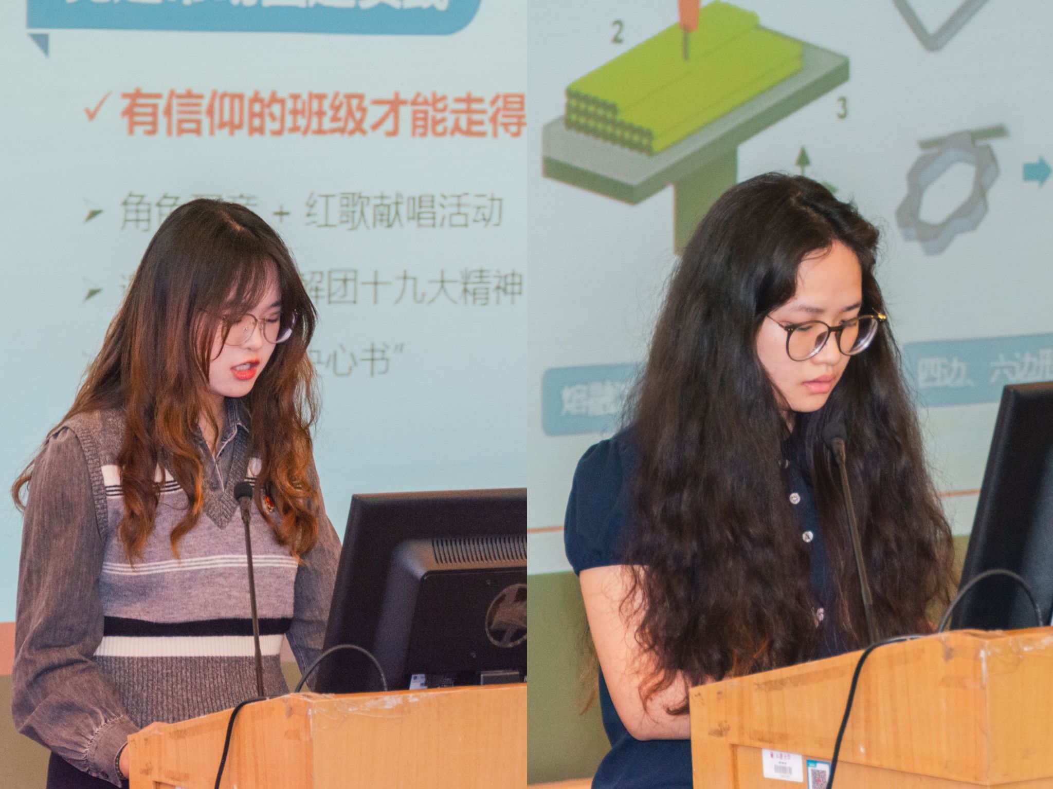 优干之星盛雨洁同学、科创之星杨倩同学作为获奖者代表,做了题为《以党建带班建,以初心促担当——“员工、班干、党员”三重身份的使命与实践》与《日就月将,学有缉熙于光明》的交流发言,分享了她们在班团活动、科创竞赛、党员身份实践等方面的经验与思考。