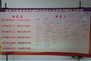 重温入党誓词,永葆党员初心使命,毕业生党员教育在铿锵有力的誓词宣誓中落下帷幕。毕业生党员签署廉洁从业承诺书。