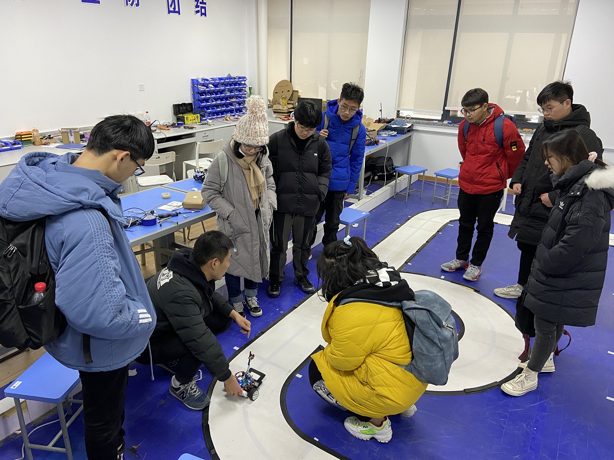 学长们分享了自己的科创经验之后,在辅导员张锋老师的带领下,大一同学们来到自强队的实验室参观,亲身感受自强队科技创新的氛围。在参观过程中,学长们认真讲解创新成果,讲述优秀队员的事迹,与同学们深入交流技术细节,宣传自强队的创新精神,鼓励同学们的创新意识和实践能力的培养。大一的员工们非常认真,饶有兴趣的进行参观学习,并进行提问和学长们进行互动。实验室参观最后,部分大一的员工和老师学长进行了合影留念。