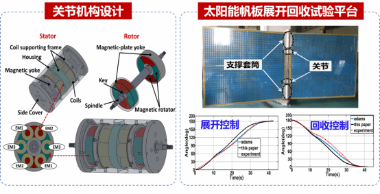 1、研制了关节原理样机,搭建了太阳能帆板微重力试验平台,实现了太阳能帆板的平稳展开/回收。