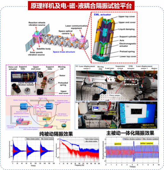 4、提出多稳态超结构、压电分流阵列、非线性电磁刚度和电磁阻尼、定位隔振一体化技术,解决多振源-多路径-多载荷超宽频微振动复合控制问题,实现0.01~200Hz超宽频段内载荷安装界面振动加速度低于0.1mg。