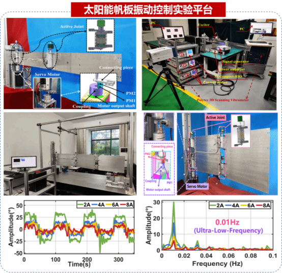 2、提出关节磁控变刚度、变阻尼半主动振动控制方法,搭建了太阳能帆板地面缩比试验平台,实现了多源激励下太阳能帆板0.01Hz超低频振动控制。